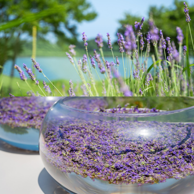 朝一番の太陽のエネルギーをたっぷり浴びたラベンダーの花を湧水を入れたガラスボウルに浮かべ3~4時間太陽光にあて、花のエネルギーを湧水に転写。
